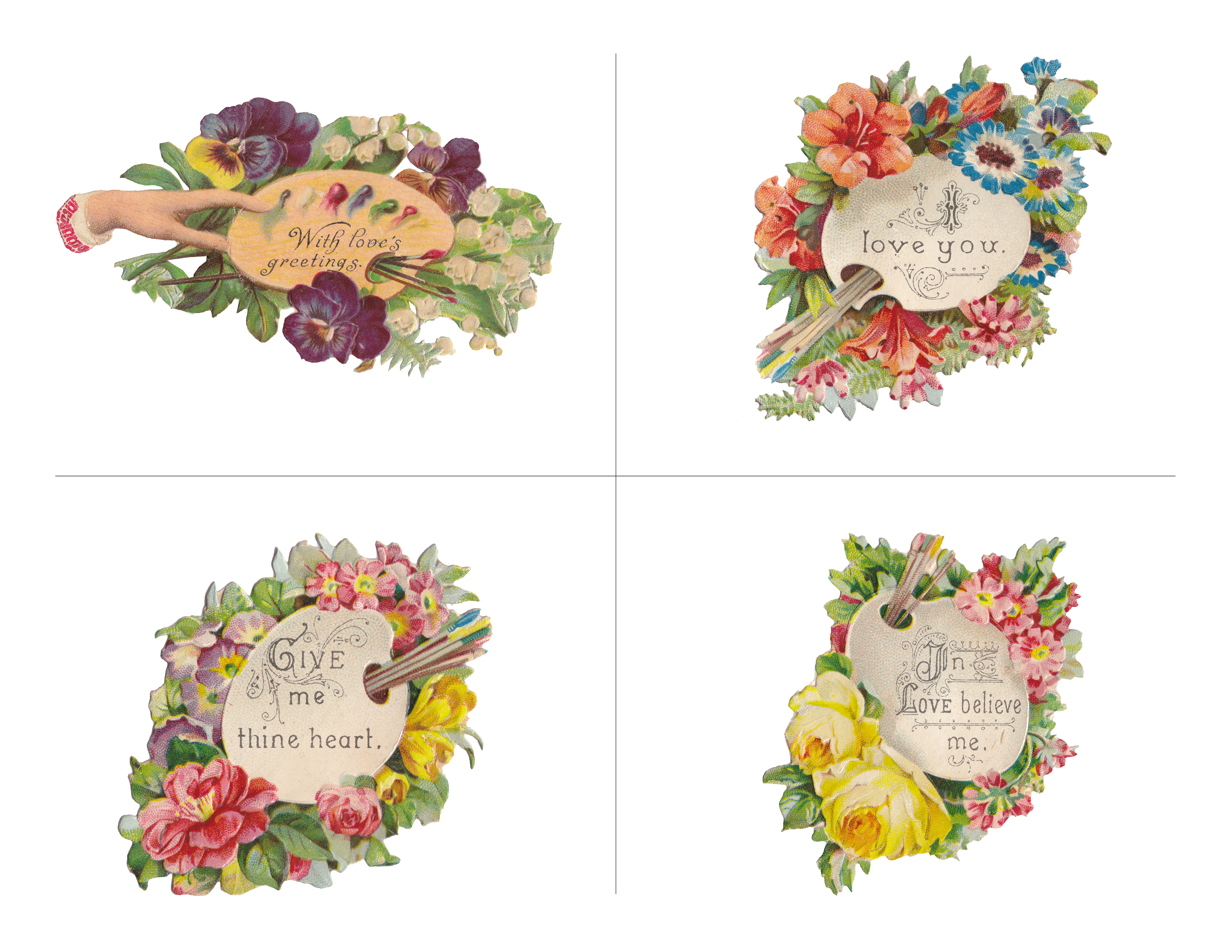 Four vintage valentines for your favorite artist. Each one features an artist’s palette with brushes and a sweet sentiment. You can click on the images below to download, or you can download each as a separate image here: