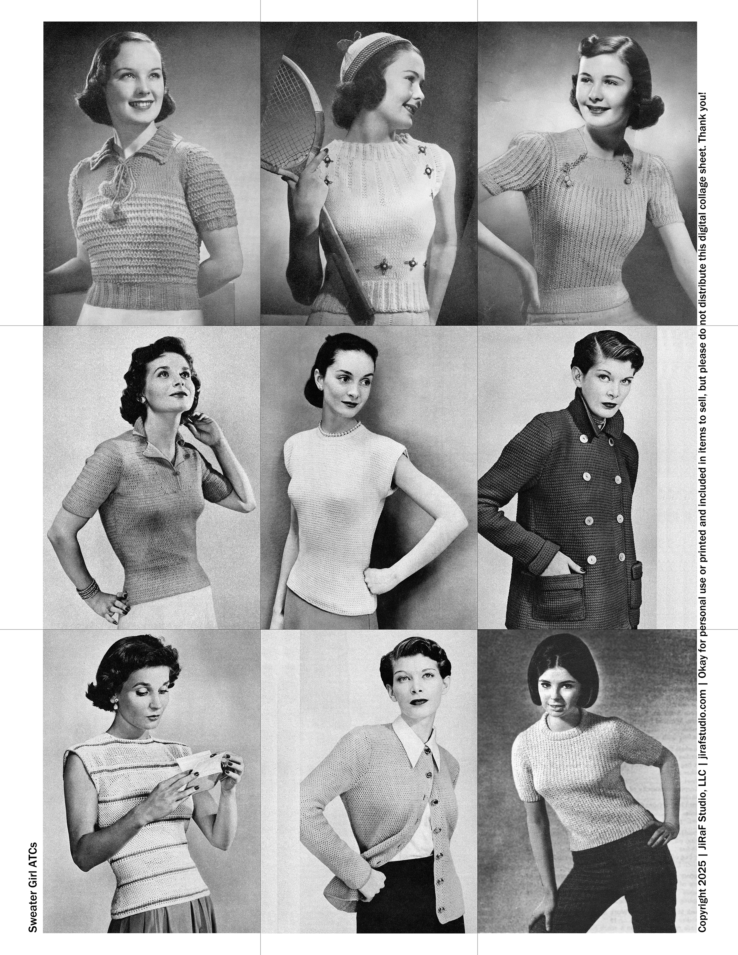 One sheet of nine artist trading cards (ATCs) to print and cut out. These are black-and-white photographs of models wearing knitted sweaters from knitting patterns of the 1940s to 1950s. Below you can download the page in three high-quality file formats: .png, .pdf, and .jpg. Please print at 100% (no scaling).