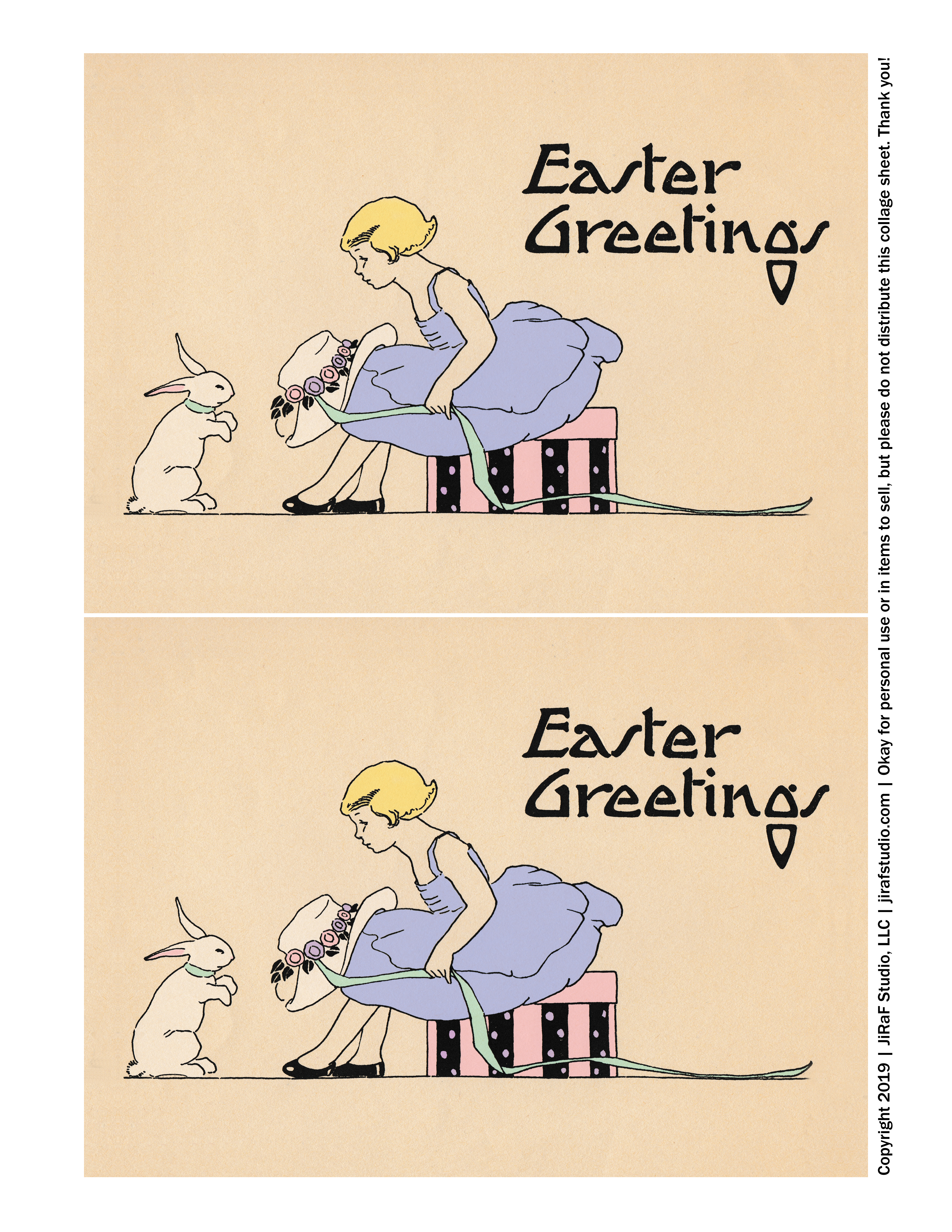 This digital download is a beautiful illustration of a young girl sitting on a hatbox while showing her Easter bonnet to a bunny. There are two sheets: one with color added, and one without. The download contains one sheet of 2 images in .jpg file format. Click on the images below to download.