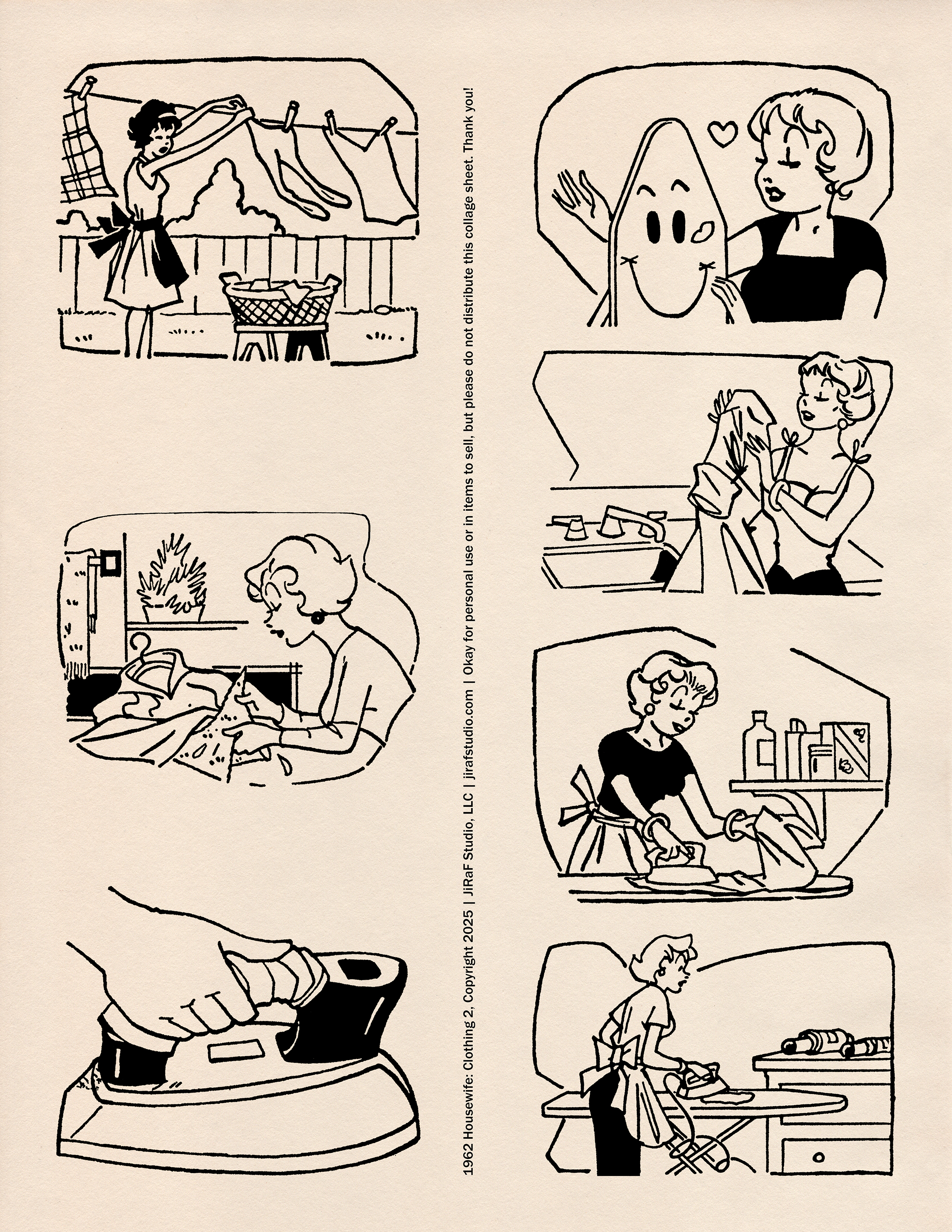 Here is a digital download of 7 cute illustrations of caring for clothing in 1962. Download, print, cut out, then add to your artwork (art journaling, junk journaling, scrapbooking, cardmaking, etc.). These would be great for Mother’s Day. And stay tuned for more from our 1962 Housewife!