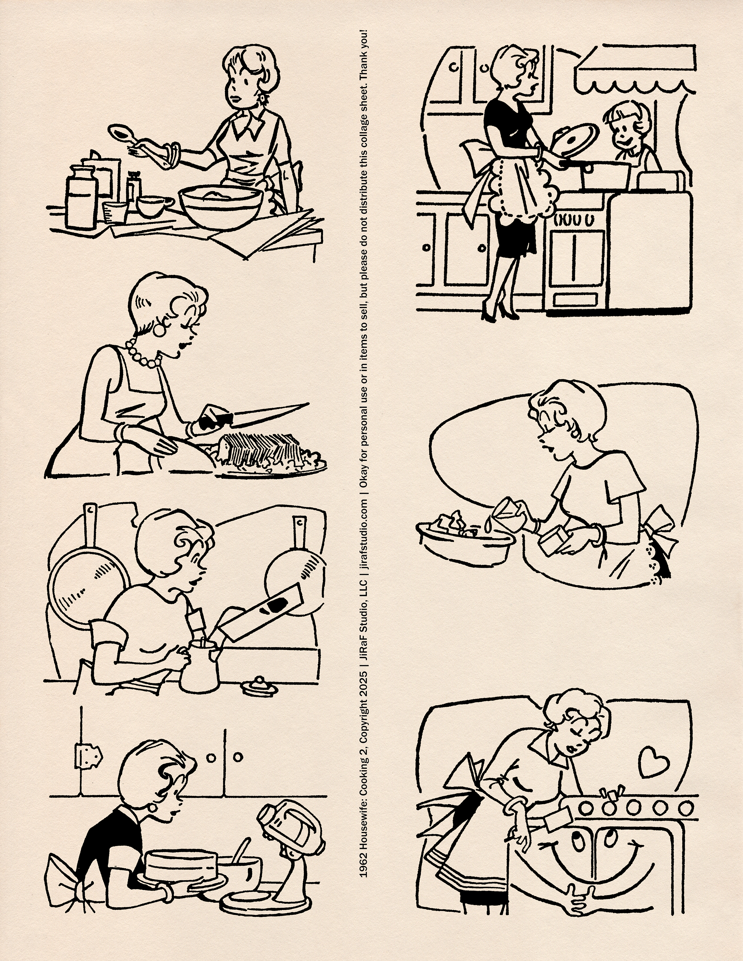 Here is a digital download of 7 cute illustrations of a woman cooking in 1962. Download, print, cut out, then add to your artwork (art journaling, junk journaling, scrapbooking, cardmaking, etc.). These would be great for Mother’s Day. And stay tuned for more from our 1962 Housewife!