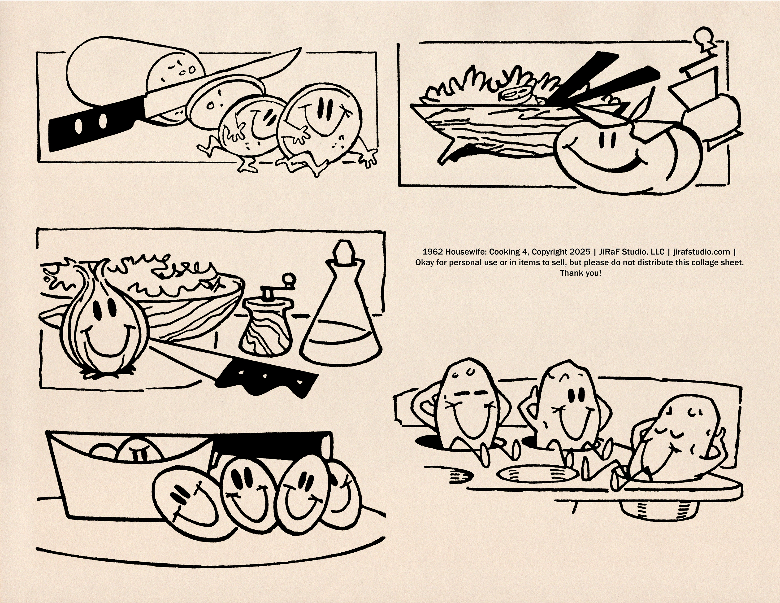 Here are two digital downloads of cute illustrations of a woman cooking in 1962. The first one contains seven different images. The second one has some of those images enlarged. Download, print, cut out, then add to your artwork (art journaling, junk journaling, scrapbooking, cardmaking, etc.). These would be great for Mother’s Day. This concludes our 1962 Housewife series.