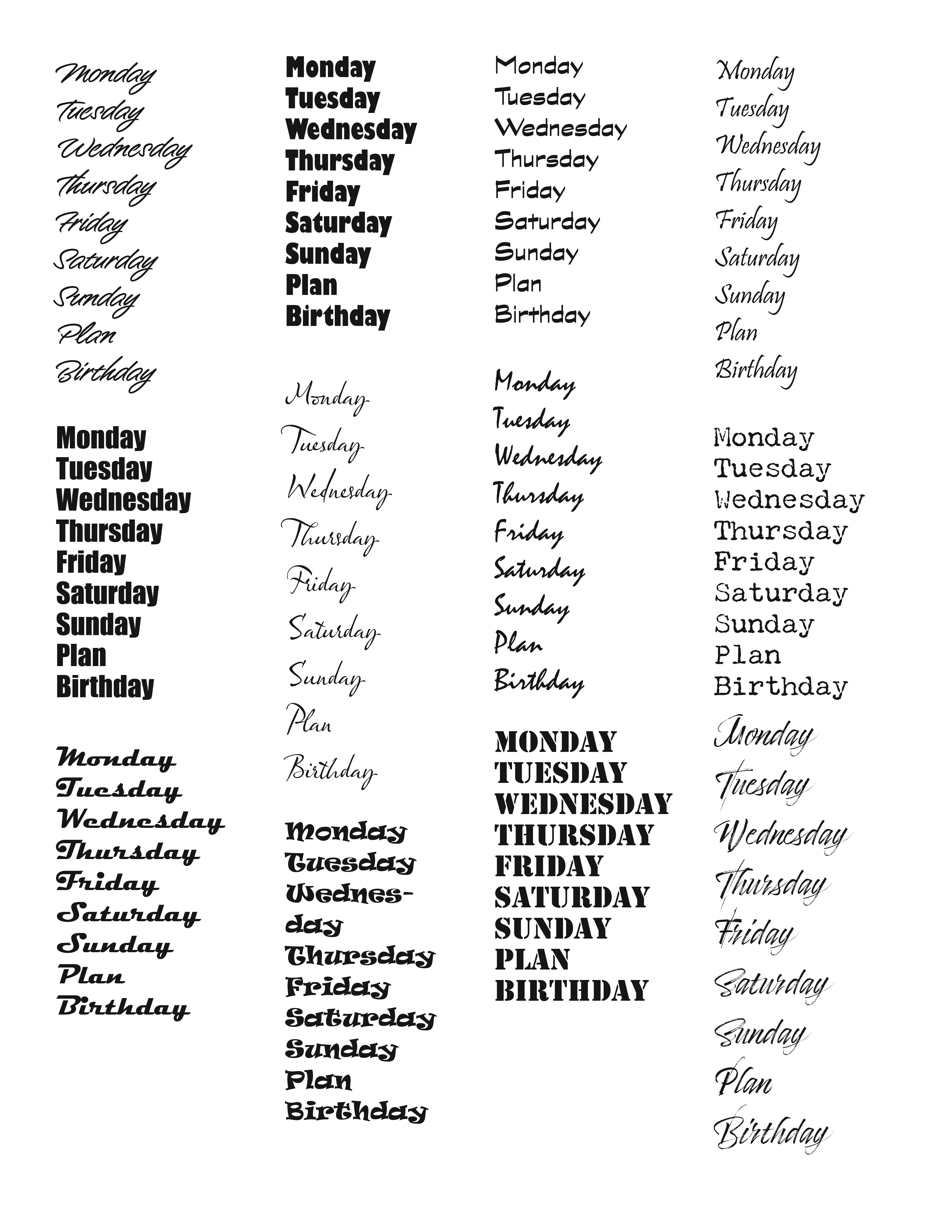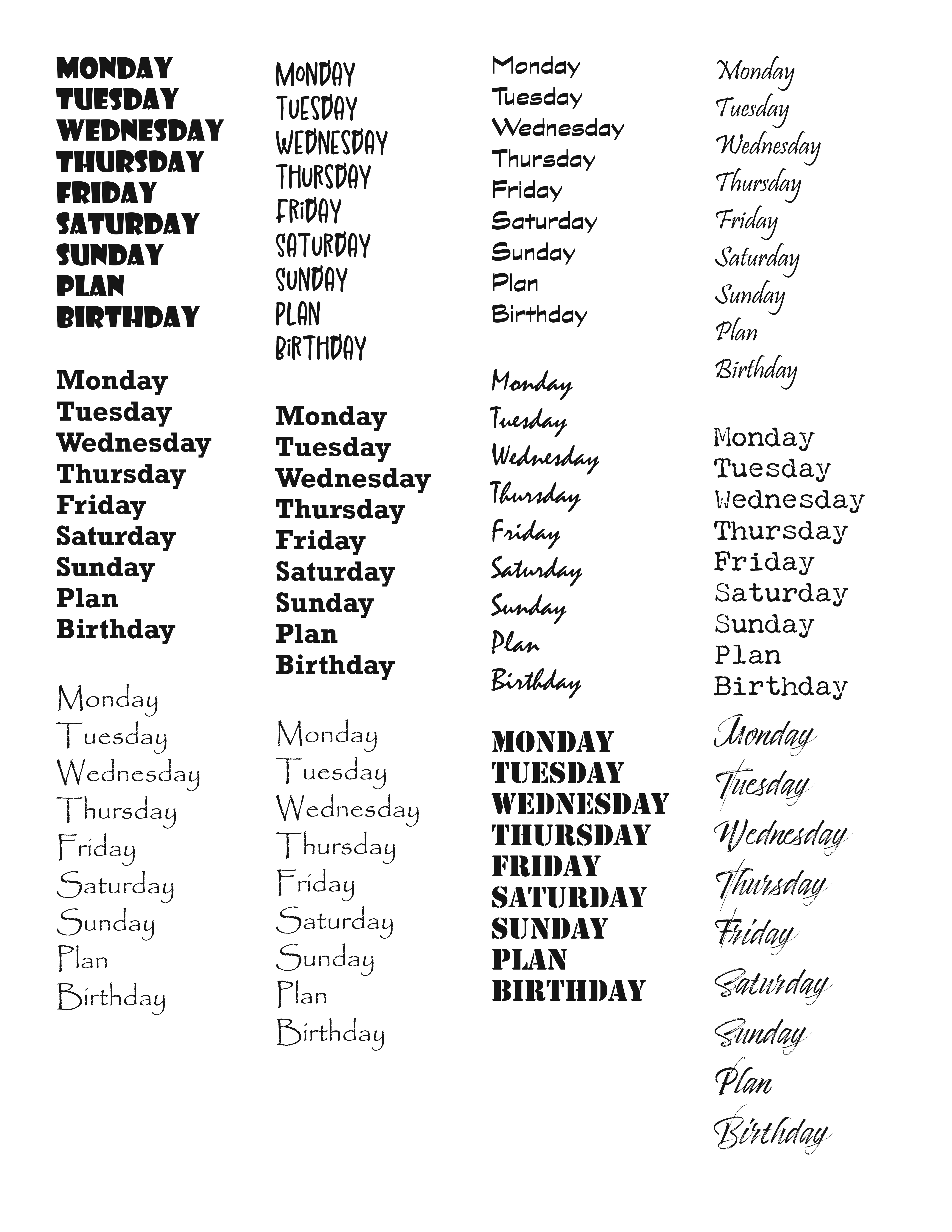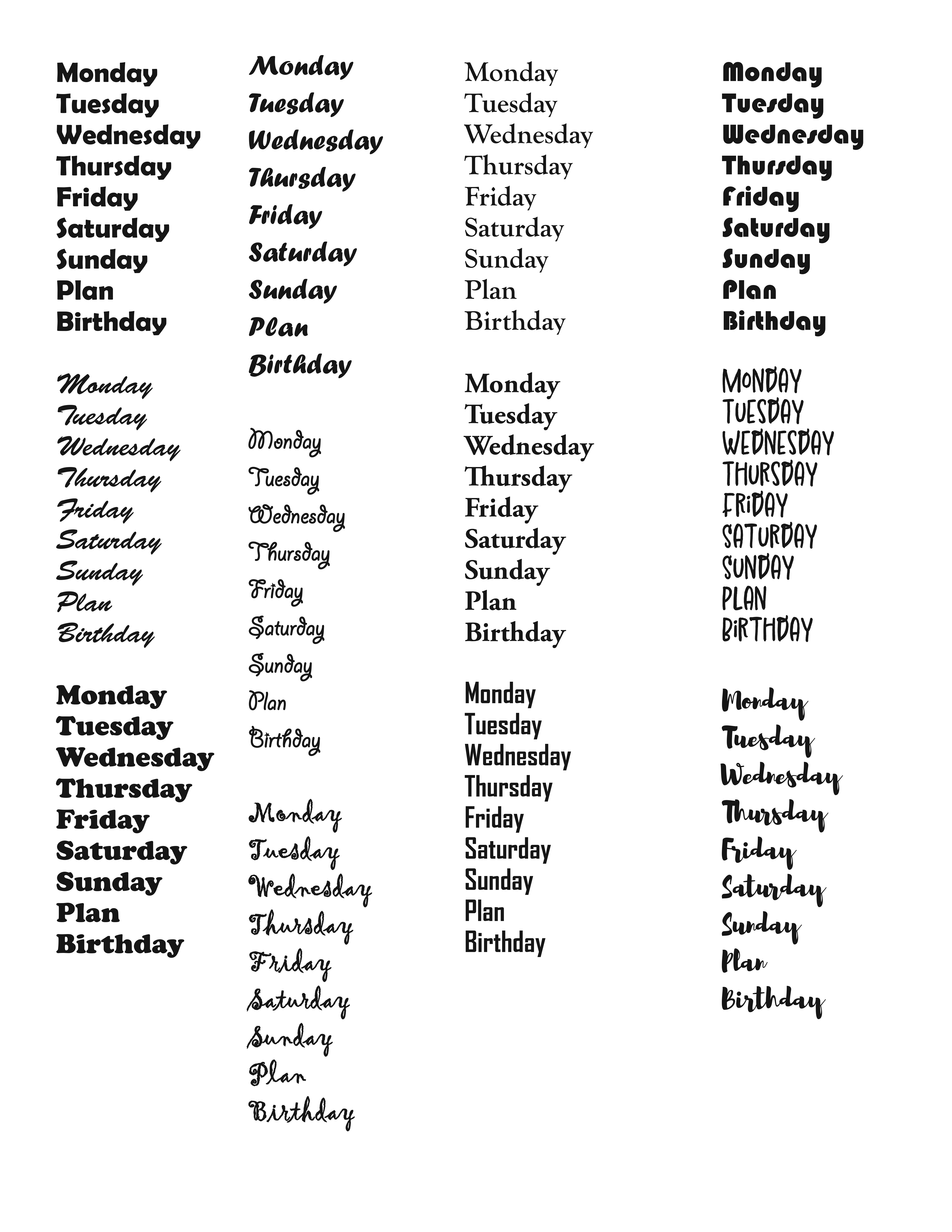 Three pages of days of the week that you can print on full-page stickers (or just nice paper and stick with glue). The line spacing should allow you to make one cut between the words. You can download the .jpg files below directly (right-click and save) or you can download a three-page .pdf file here.