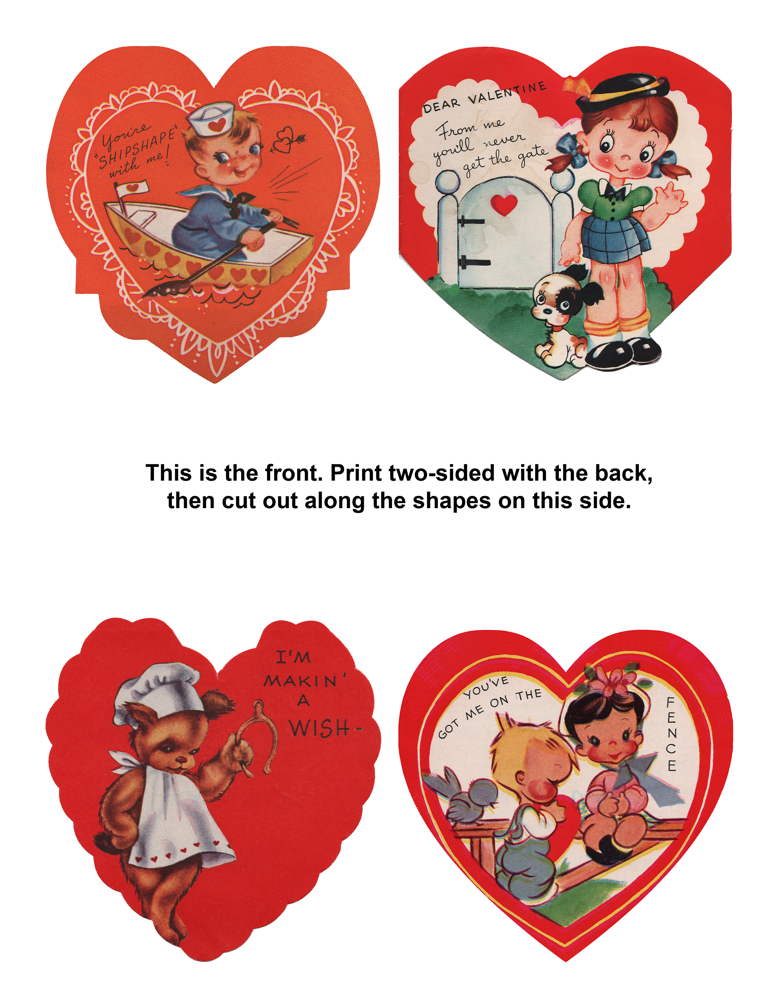 Here’s a collection of 5 retro valentines, front and back, in two separate .pdf files: